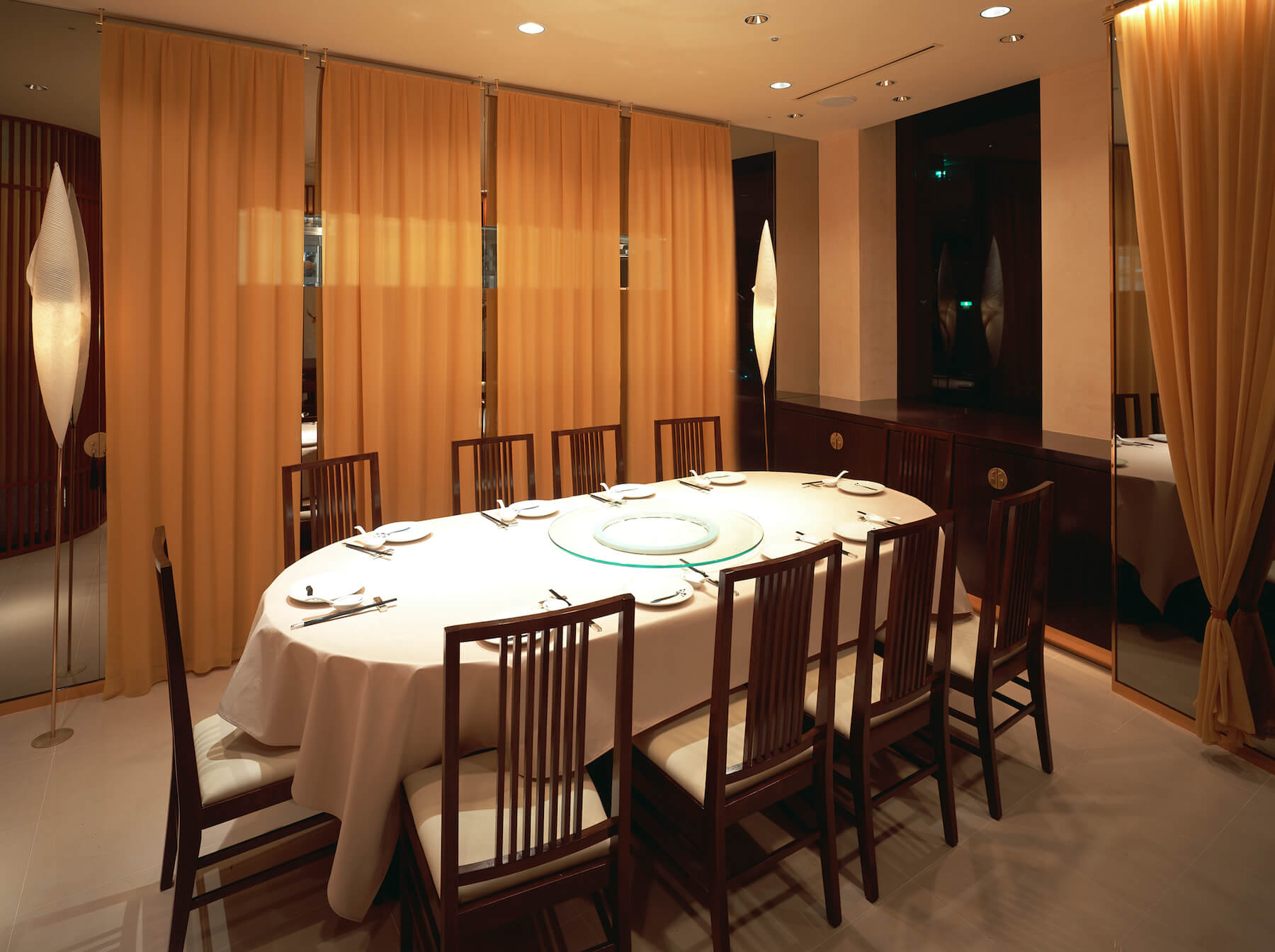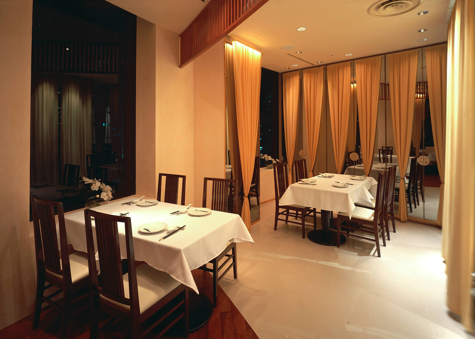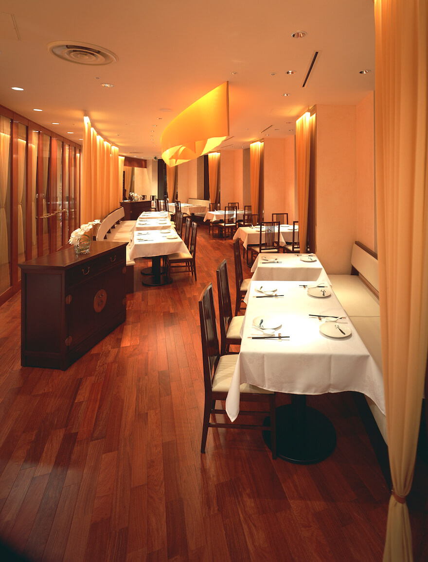 大阪「四川料理の達人」の店 黄土色のシルクで覆った内装