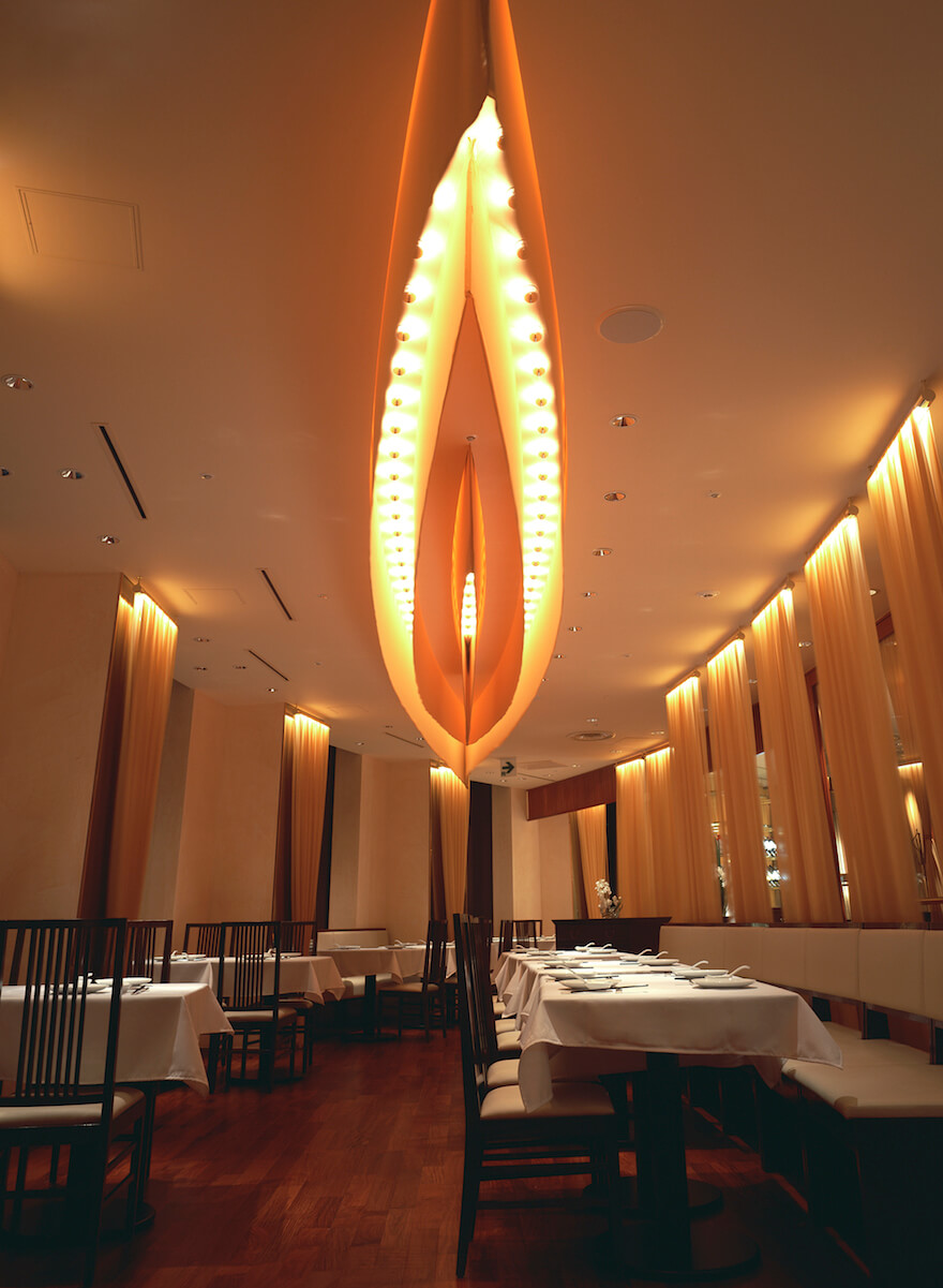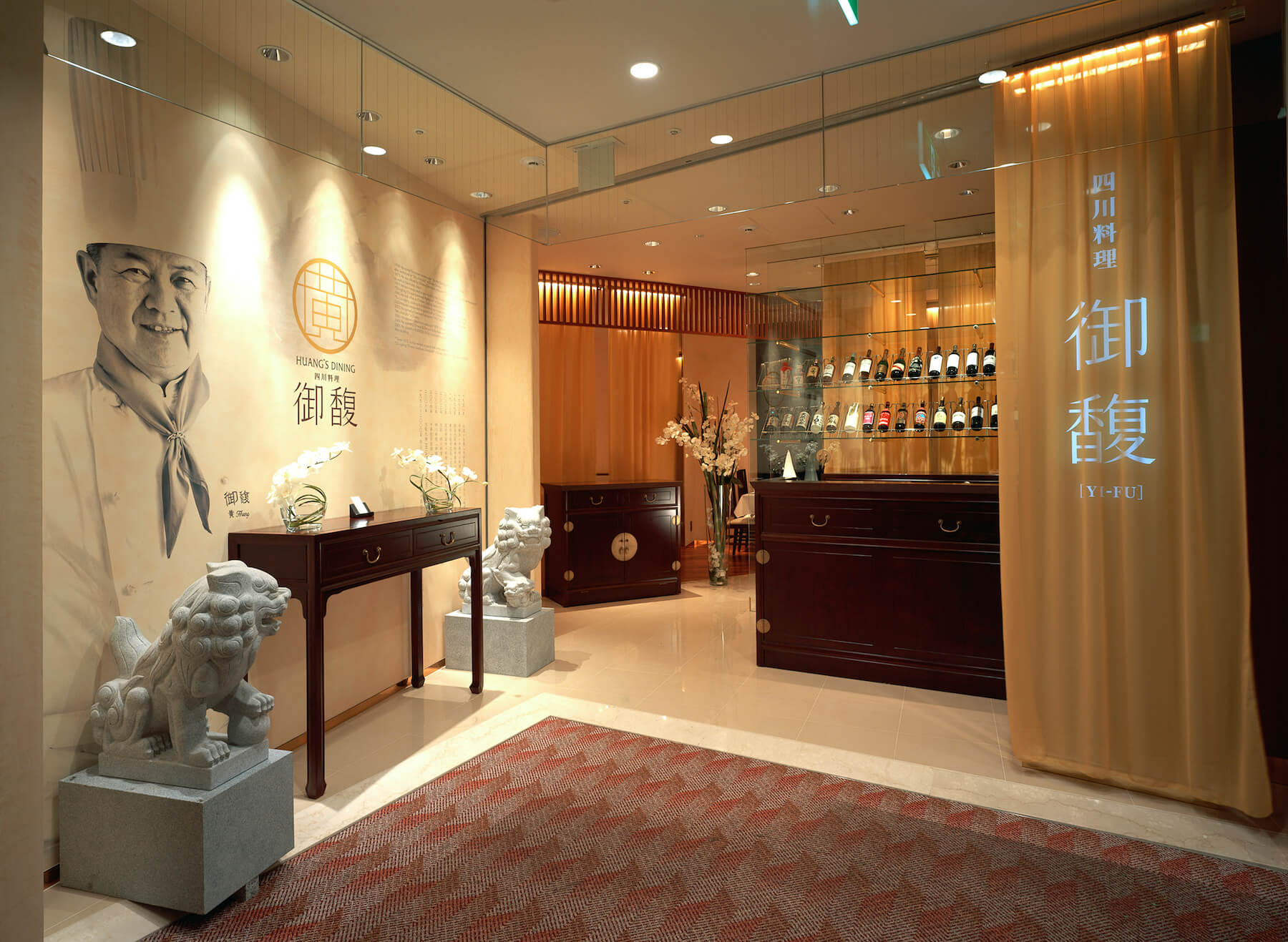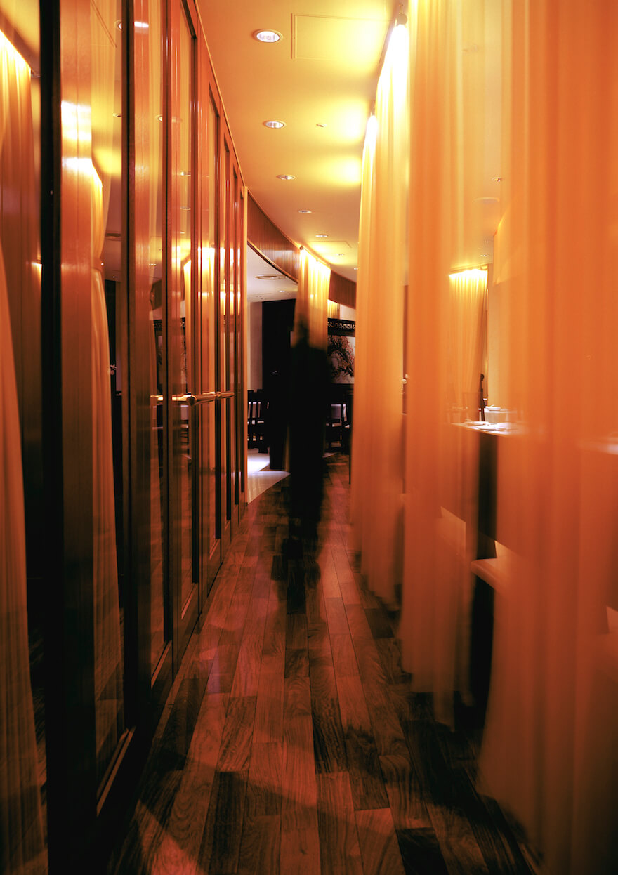 大阪「四川料理の達人」の店 黄土色のシルクで覆った内装
